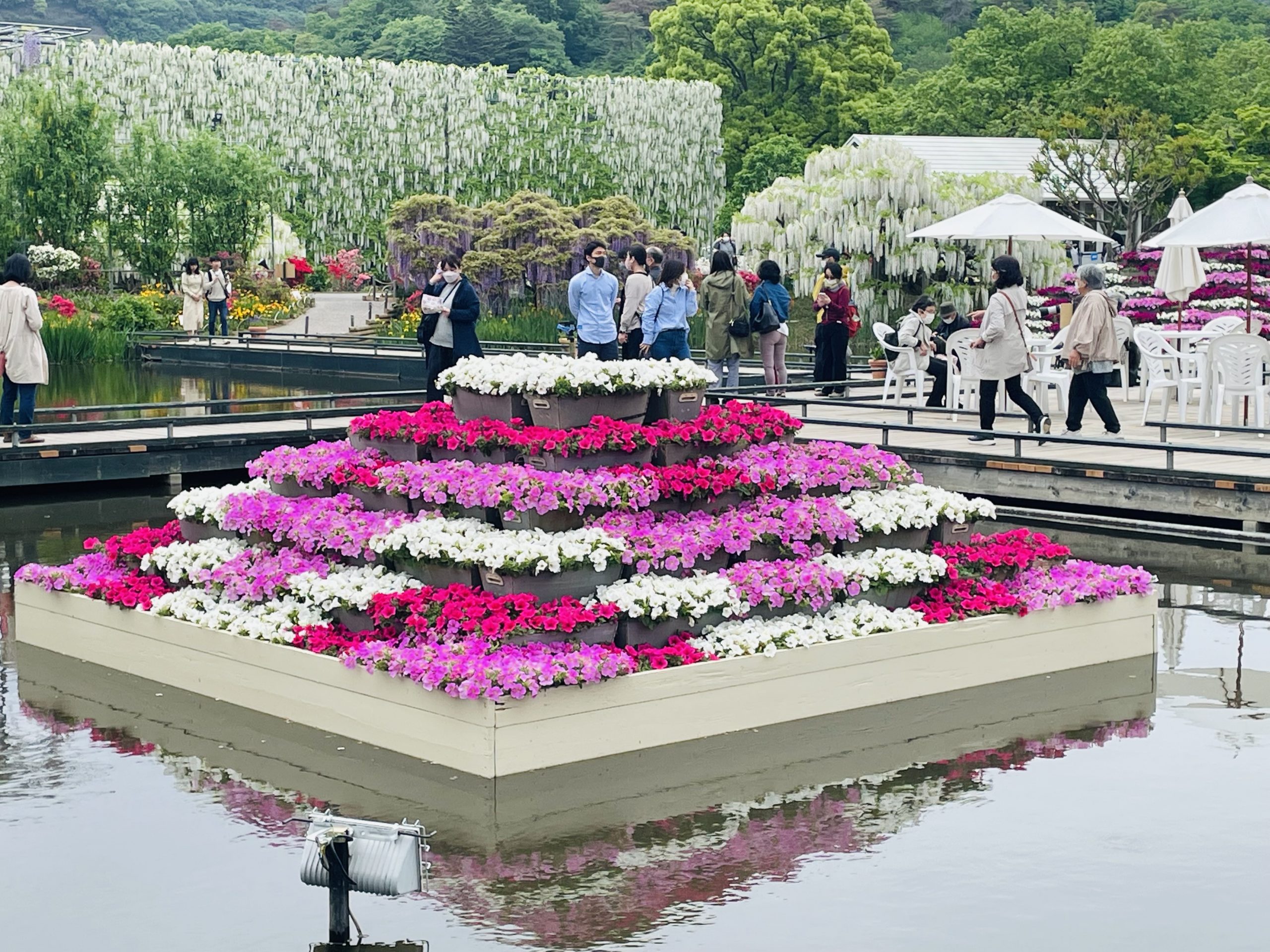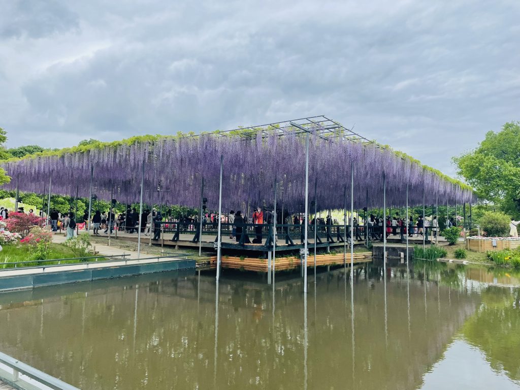 見どころは大藤だけではなく、長さ80mもの「白藤のトンネル」や「白藤の海」「きばな藤」など、色とりどりの藤の花が楽しめます。