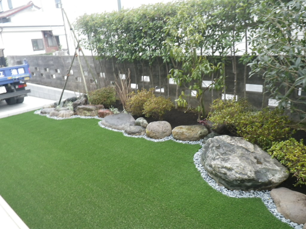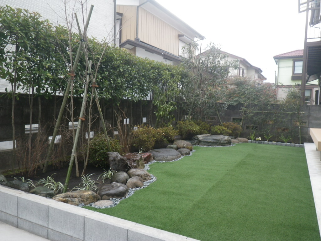 なるべく手がかからない庭にしたいという事で、人工芝を敷いて雑草も生えにくくしております。