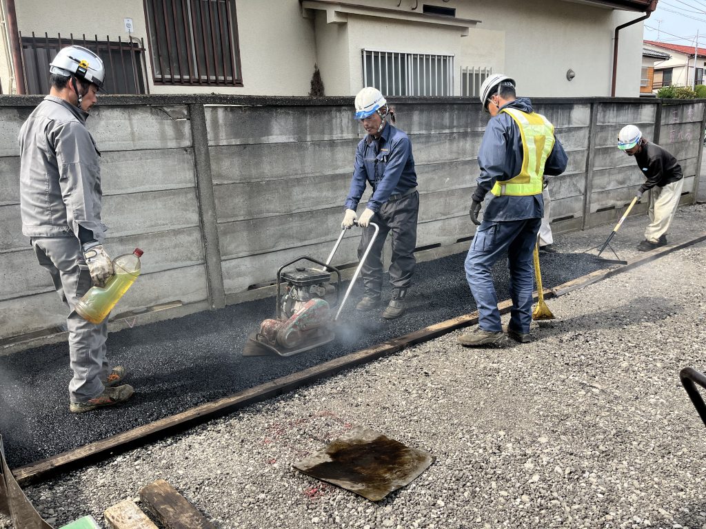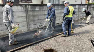 今日は道路予定地の舗装を行いました!150度にもなるアスファルトを230平米敷き固め、面積の測定を行いました!