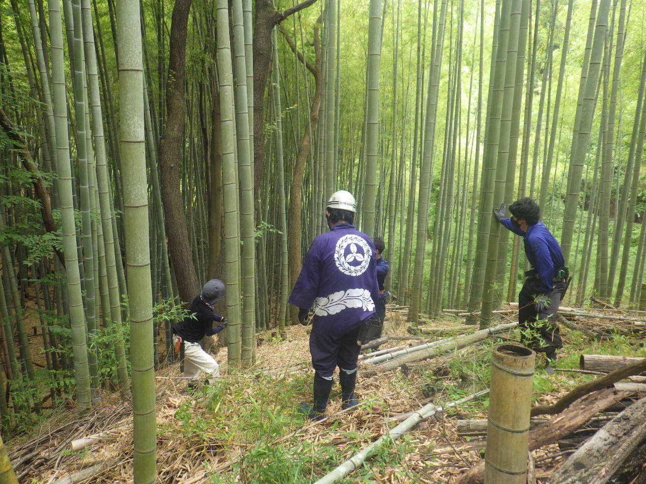 4グループに分かれ、午前中は竹穂の枝集め、竹の伐採、竹穂を支える柱づくり。